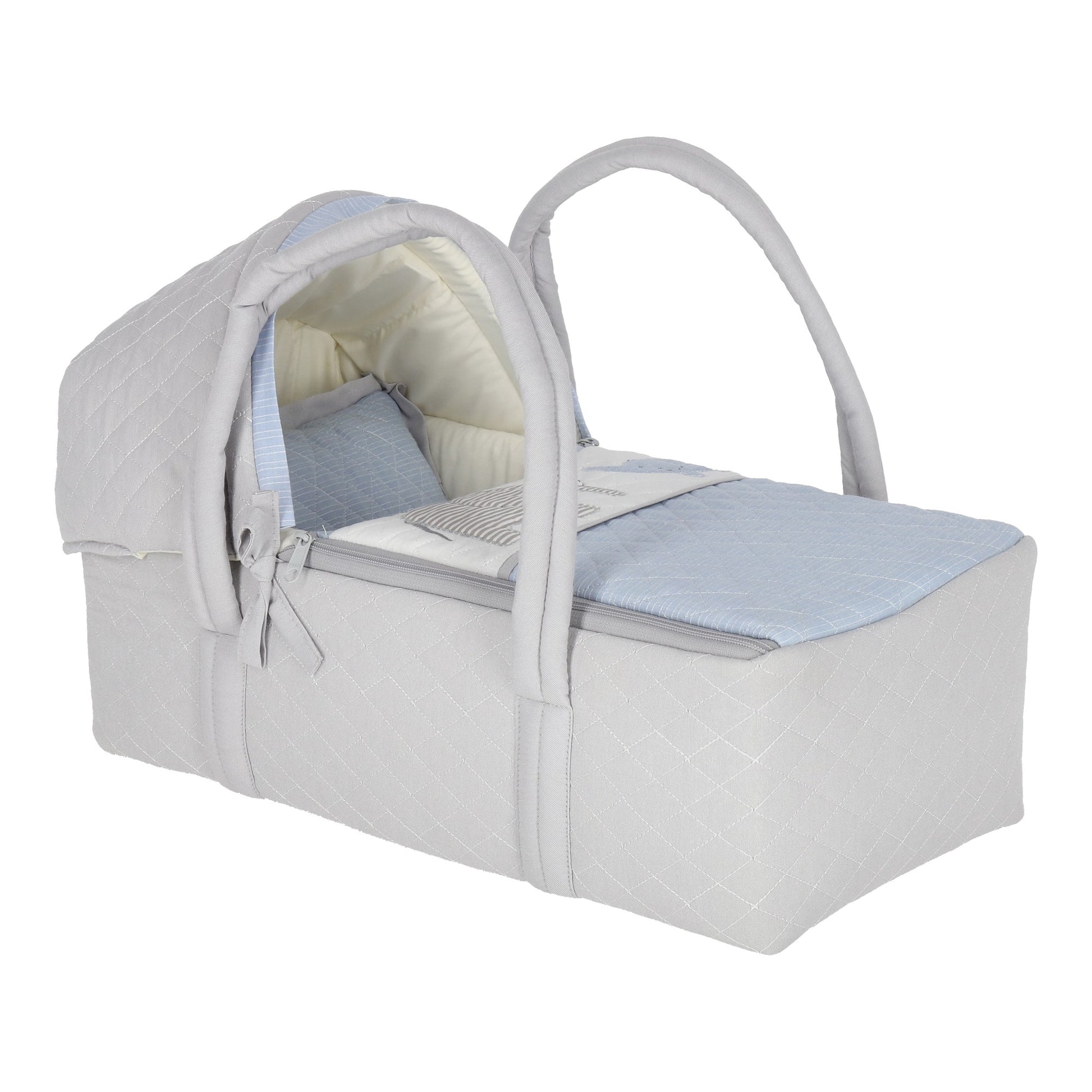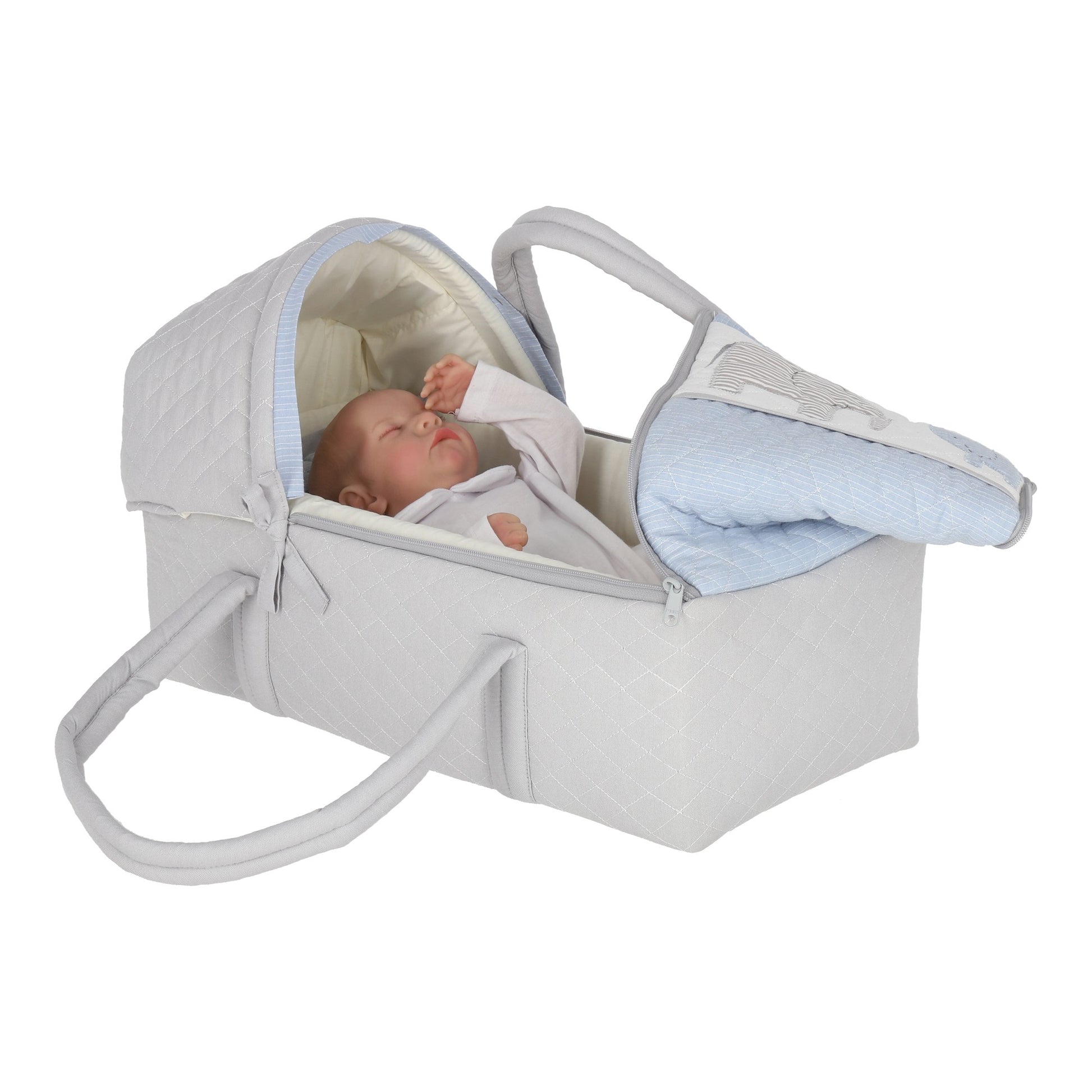 Bambineto para muñeca. Base y gorro de tela capitonada color gris con azul pastel. La tapa tiene un detalle de bordado con tiernos elefantes en tonos de gris y azul pastel. Ideal para que las niñas juegues con su muñeco niño o niña, acuesten a sus bebés, los pongan al lado de su cama como cunas y las lleven a cualquier lado. Las asas de tela están súper reforzadas para cargar a la muñeca a cualquier lugar. Armazón es de fierro soldado super resistente, incluye colchón con sábana de cajón blanca.