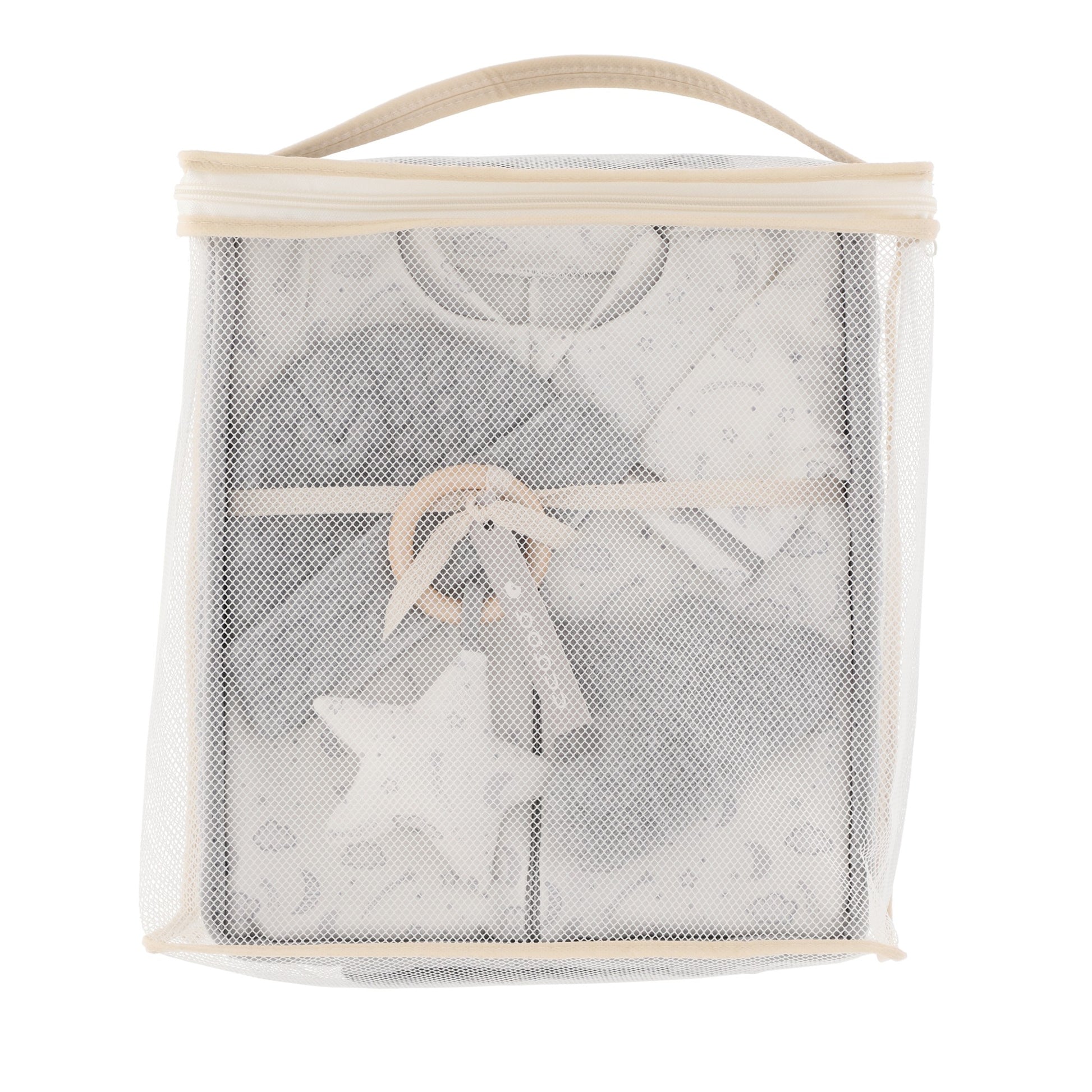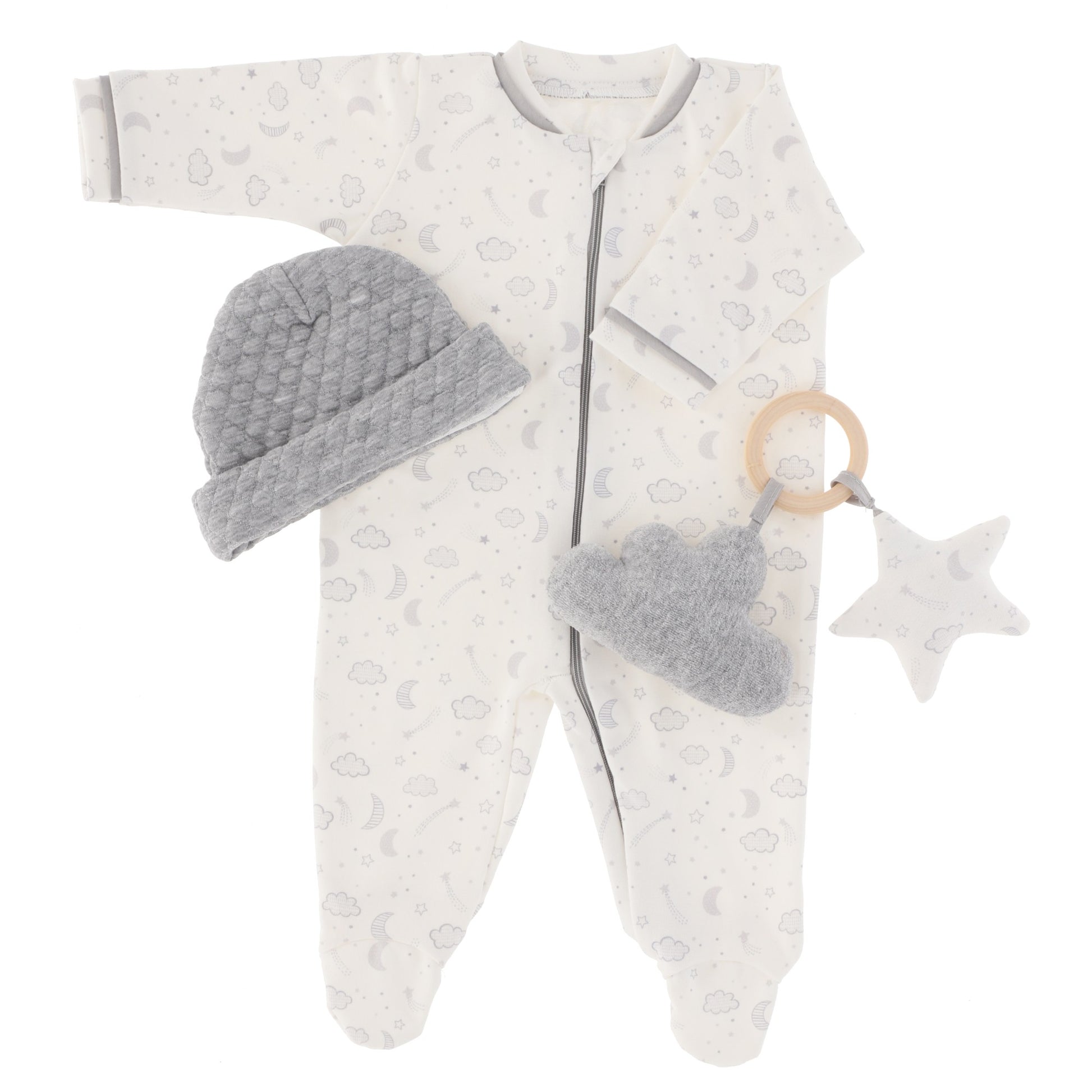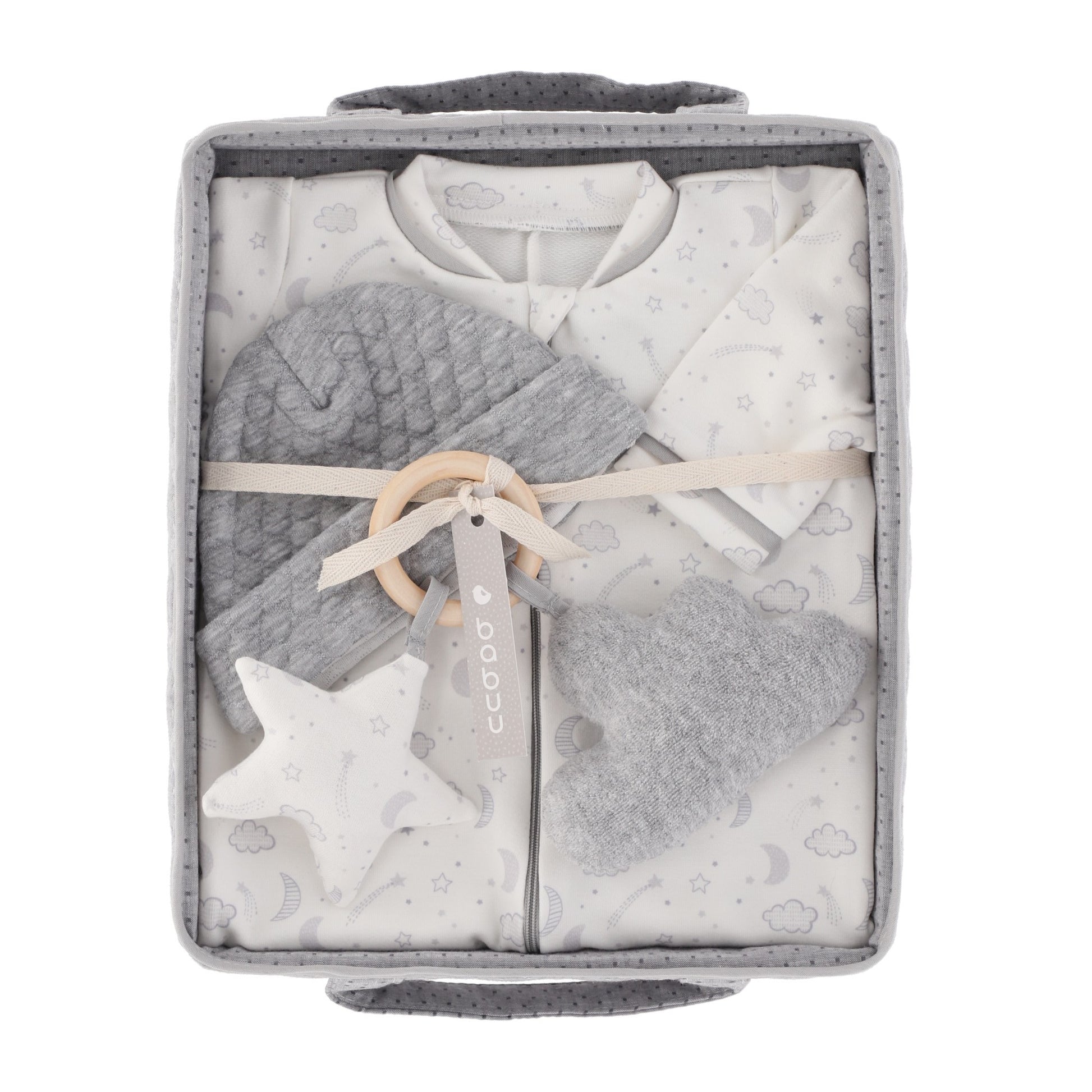 Cesto de recién nacido de mameluco de estrellas gris con sonaja. Incluye 1 cesto multiusos de tela capitonada gris, 1 mameluco de tela polo super suave estampado con estrellas y nubes en tonos de gris, 1 gorro para recién nacido de tela gris con textura de bolitas y una sonaja con estrella y nube de peluche con aro de madera.