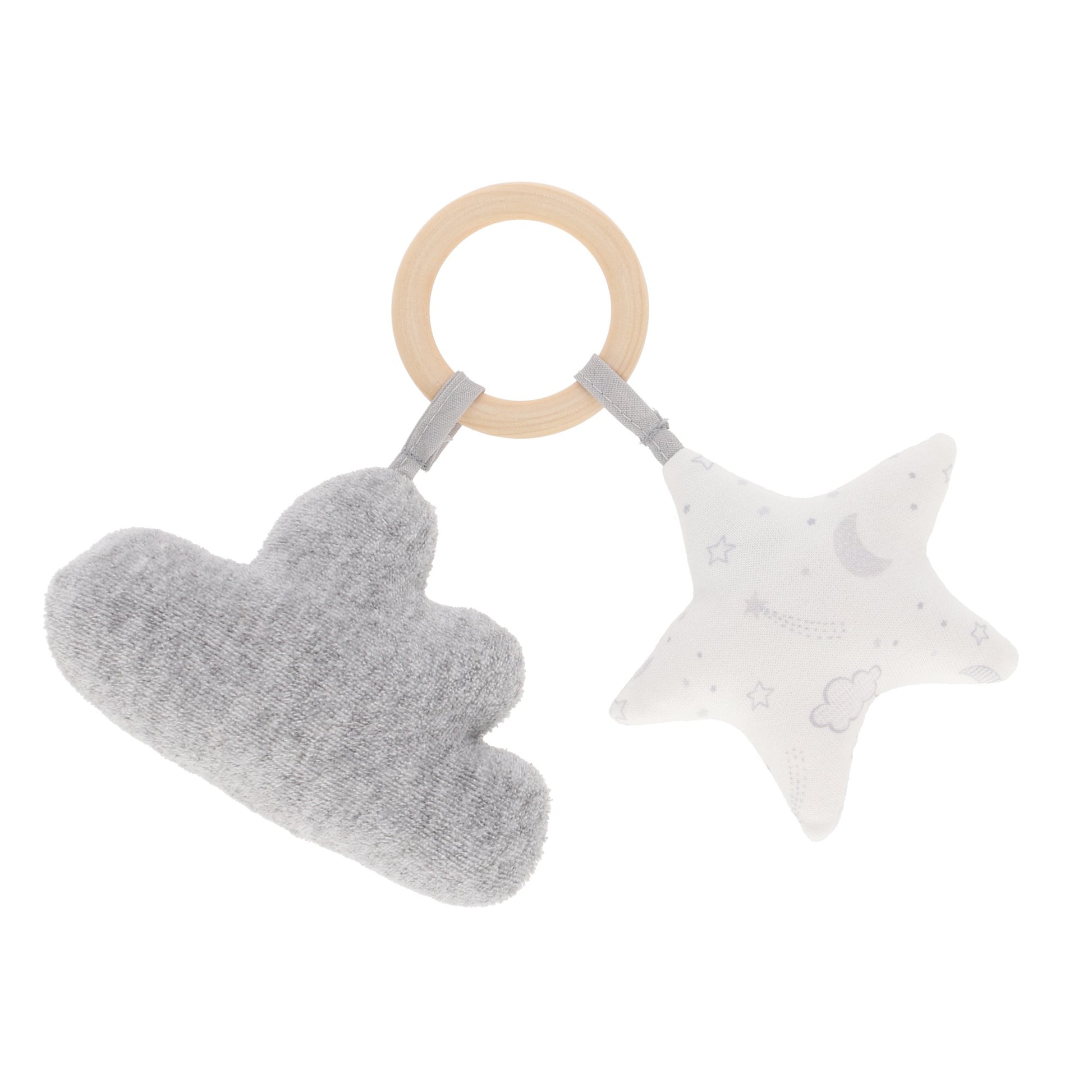 4. Sonaja con 1 estrellas estampada de peluche y una nube gris de peluche y otra de tela estampada de arcoíris, con aro de madera.