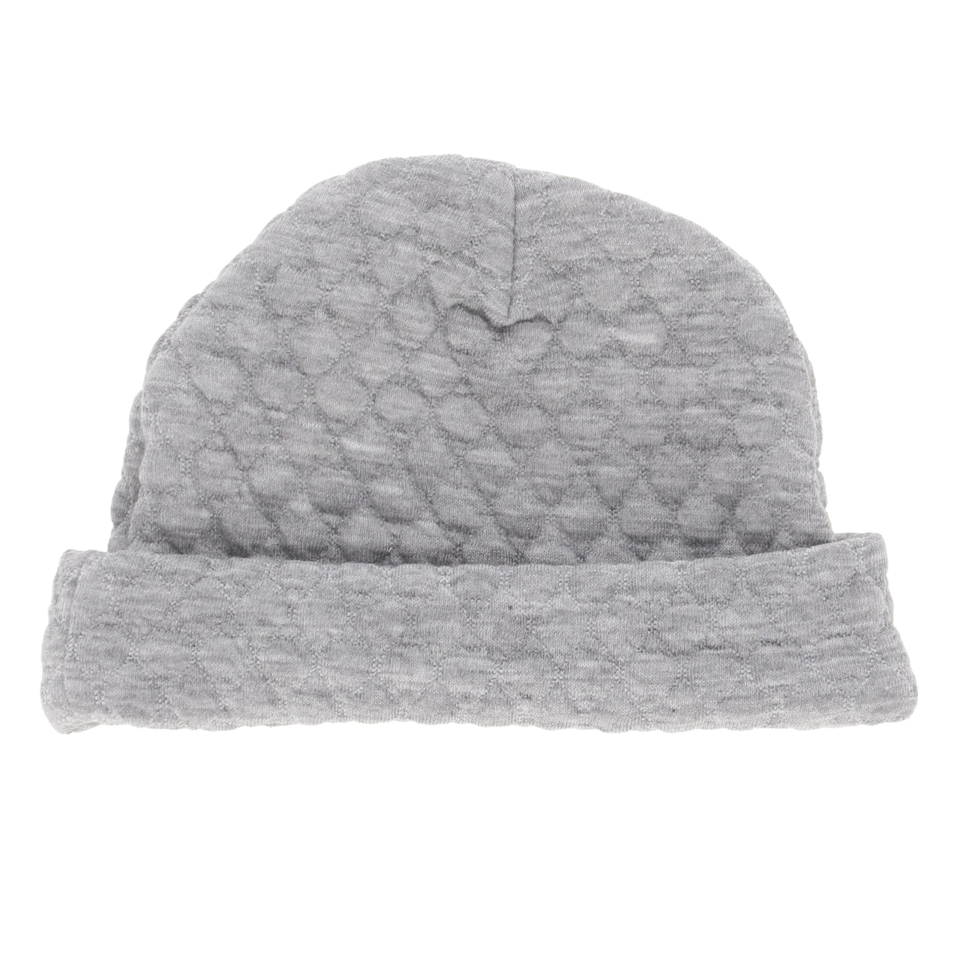3. Gorro para recién nacido de tela gris con textura de bolitas. Talla 0 a 3 meses.