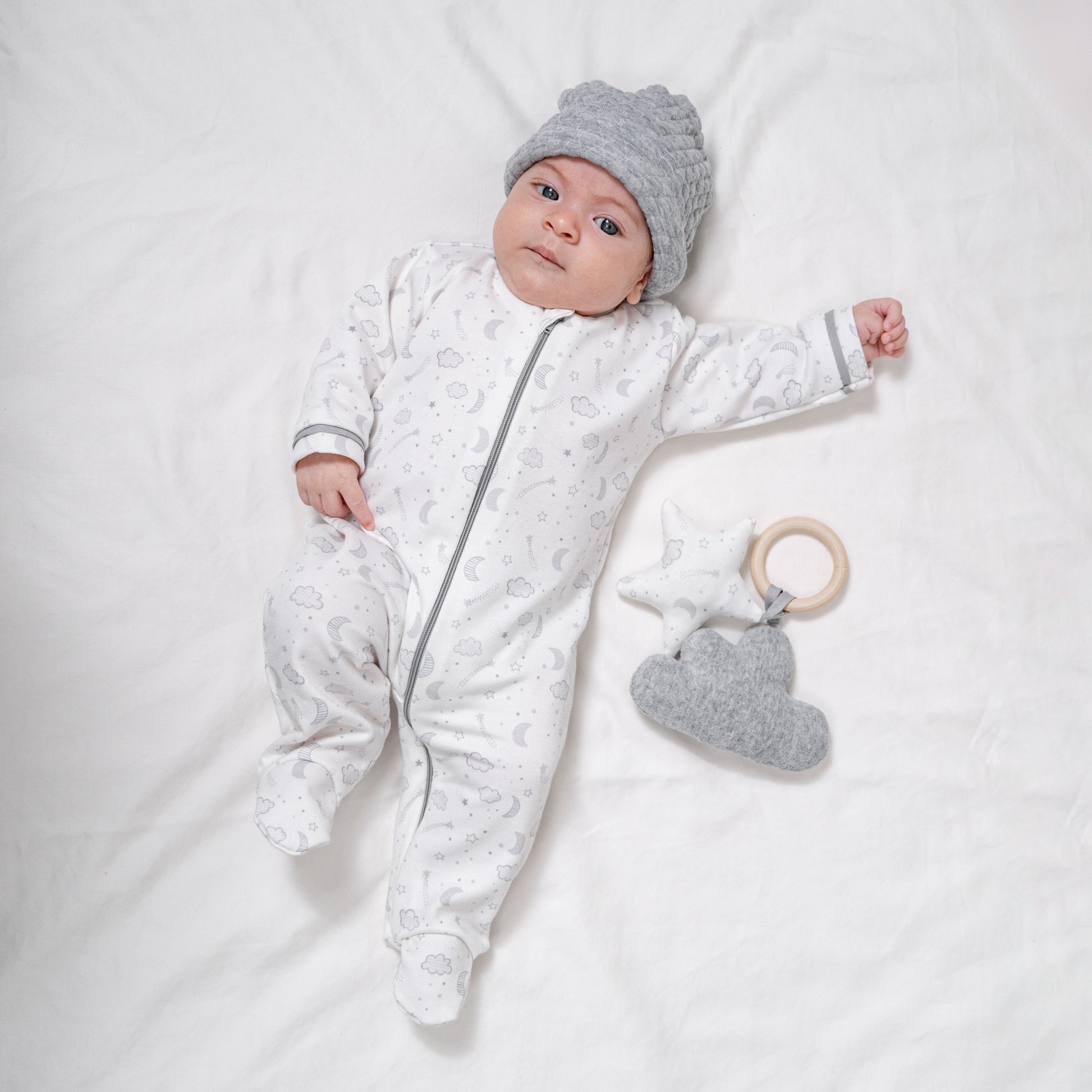 2. Mameluco para recién nacido talla 0 a 3 meses. Tela de polo super suave estampado con estrellas y nubes en tonos de gris. Es ideal para climas templados, tu bebé siempre se mantendrá fresco. Cuenta con un práctico cierre desde el tobillo a la barbilla, para facilitar cambio el cambio de pañal. Cuenta con pestaña de seguridad en el cierre para proteger el cuello del bebé.