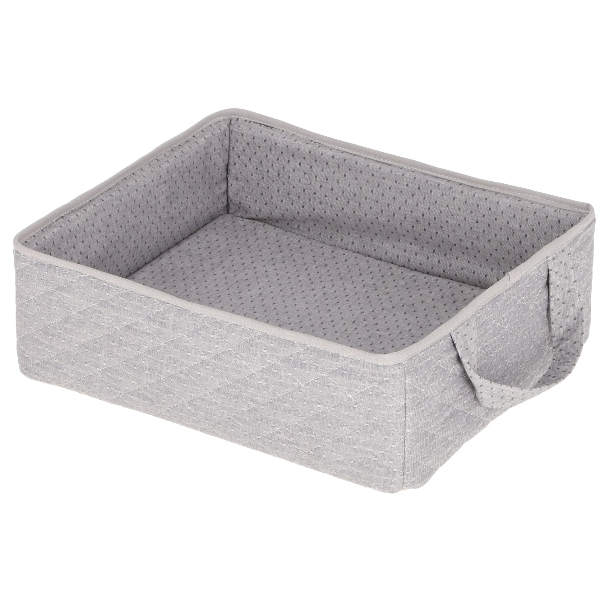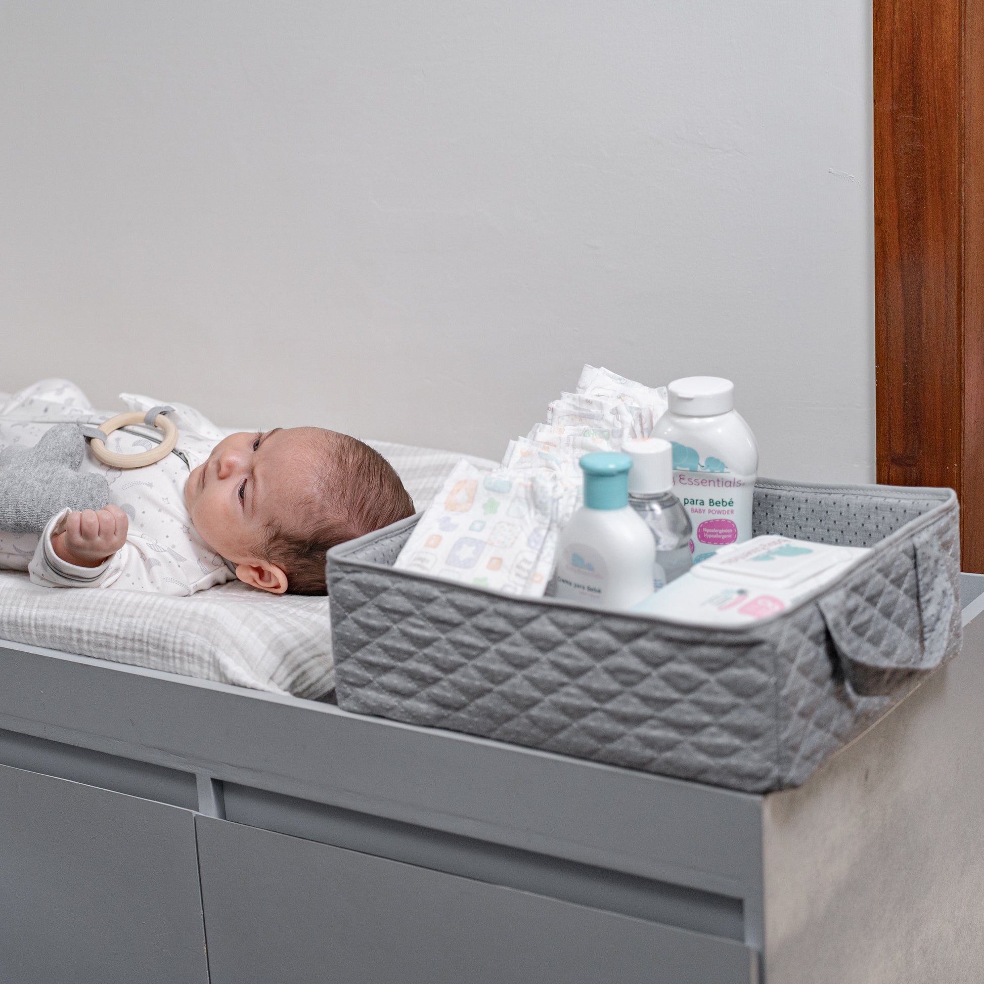 1. Cesto multiusos de tela capitonada gris con 2 asas 36 x 26 x 10 cm. Ideal para la cómoda para organizar los pañales, cremitas y toallitas húmedas. Interior de plástico para su fácil lavado.