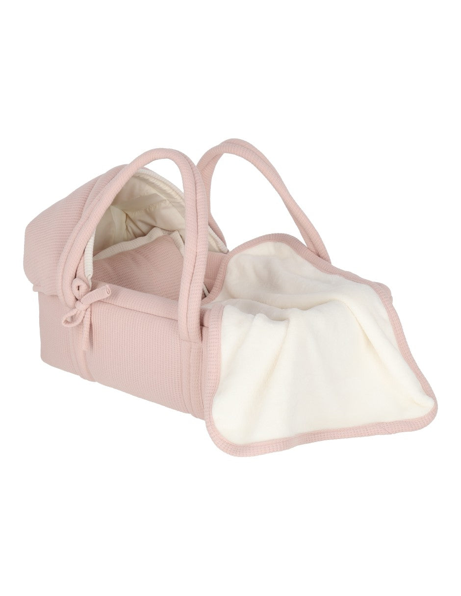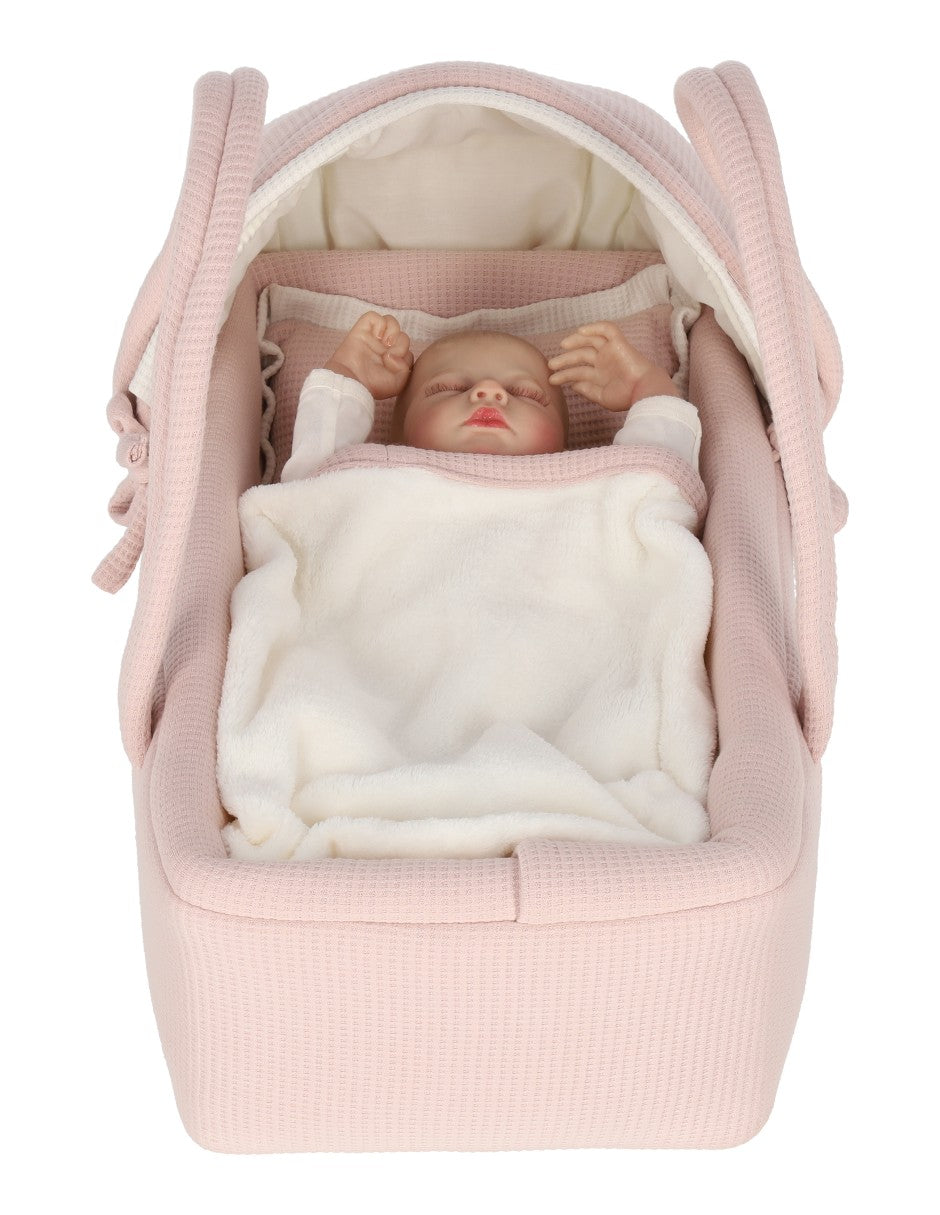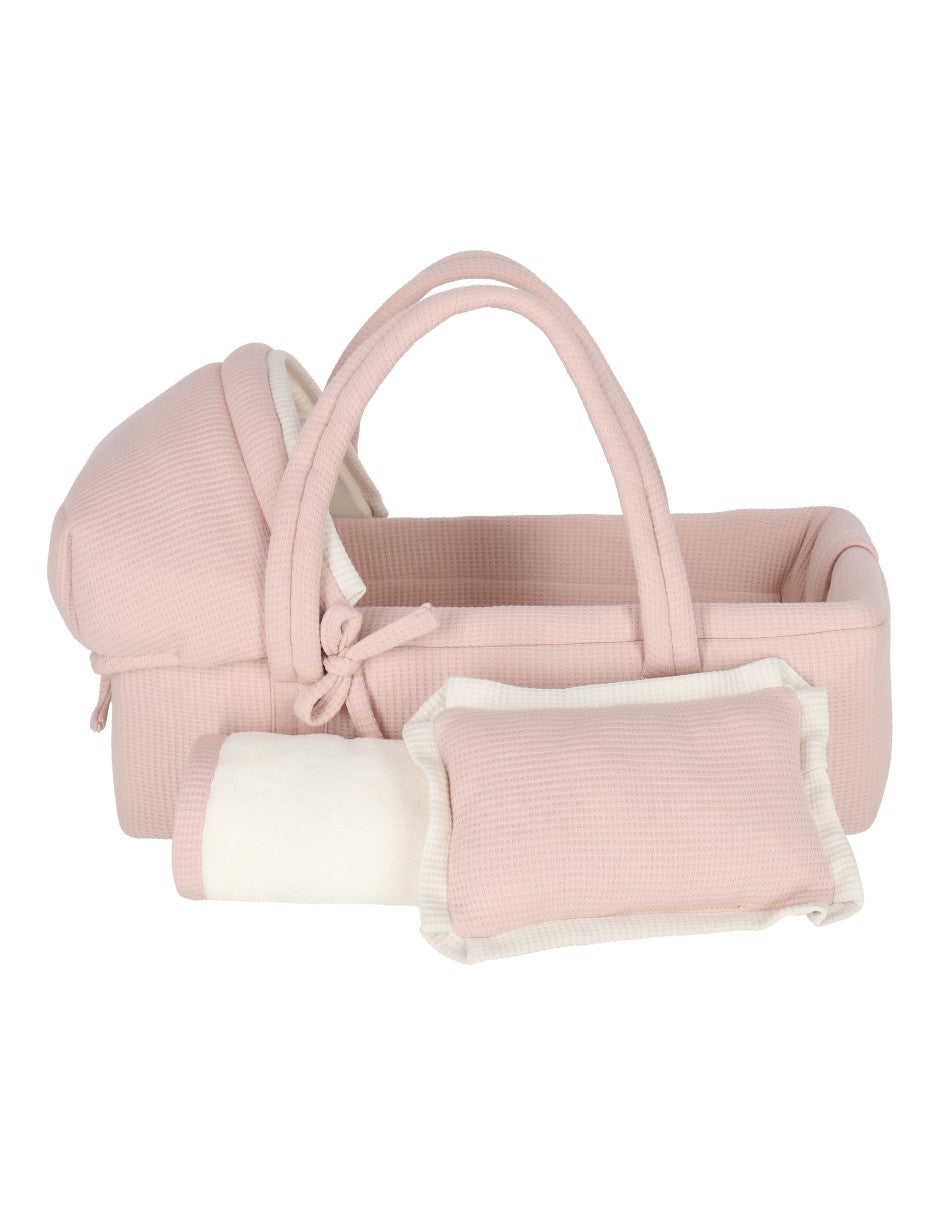Moisés para muñeca cuadritos rosa con cobija de peluche beige. El Moisés tiene la base en el exterior e interior de tela rosa palo con textura de cuadritos y detalles en color beige. Ideal para que las niñas juegues con sus muñecas, acuesten a sus bebés, los pongan al lado de su cama como cunas y las lleven a cualquier lado. Las asas de tela están súper reforzadas para cargar a la muñeca a cualquier lugar. el armazón es de fierro soldado super resistente e incluye colchón con sábana de cajón blanca. Se puede quitar la funda del bambineto, el armazón y el soporte de madera para lavar en casa.