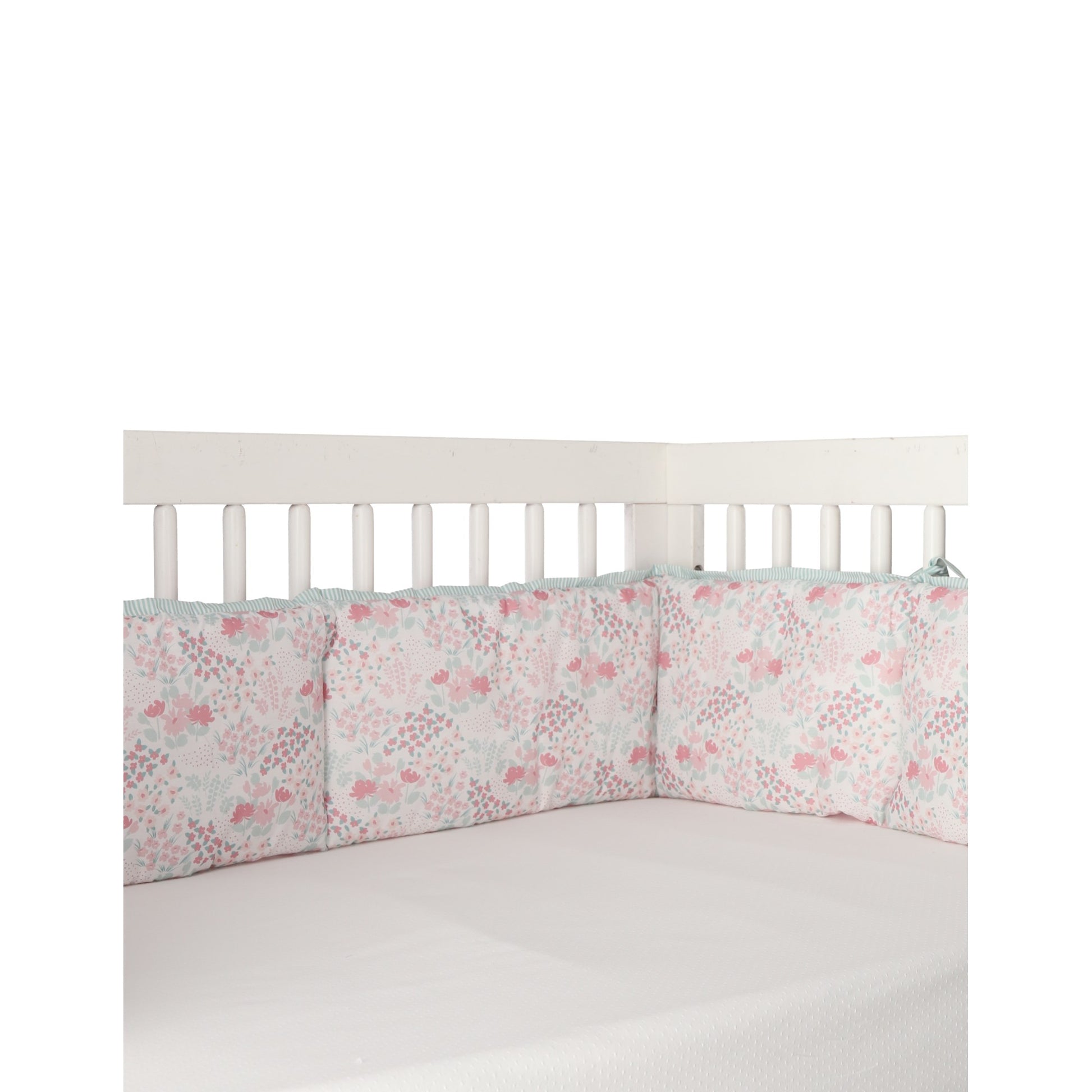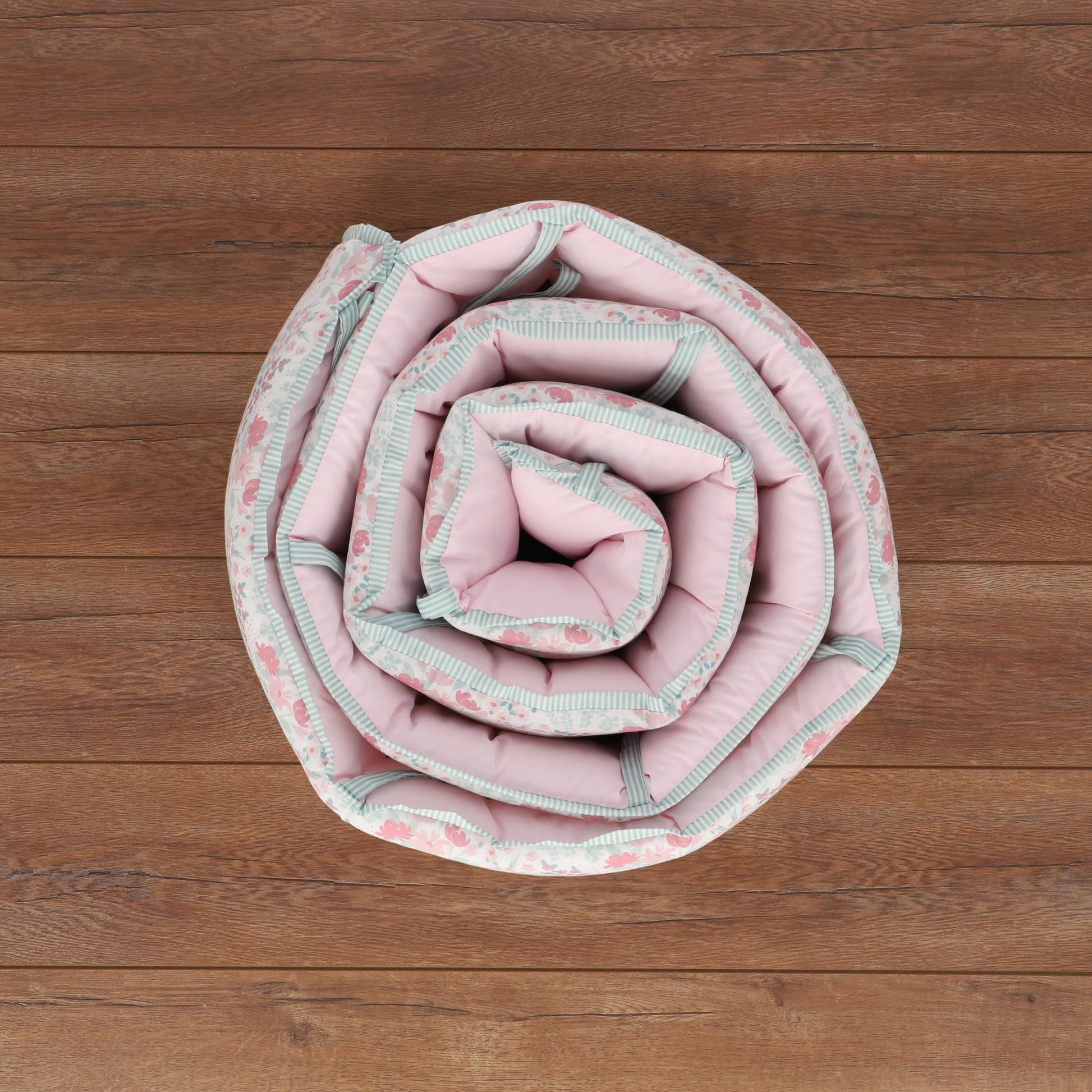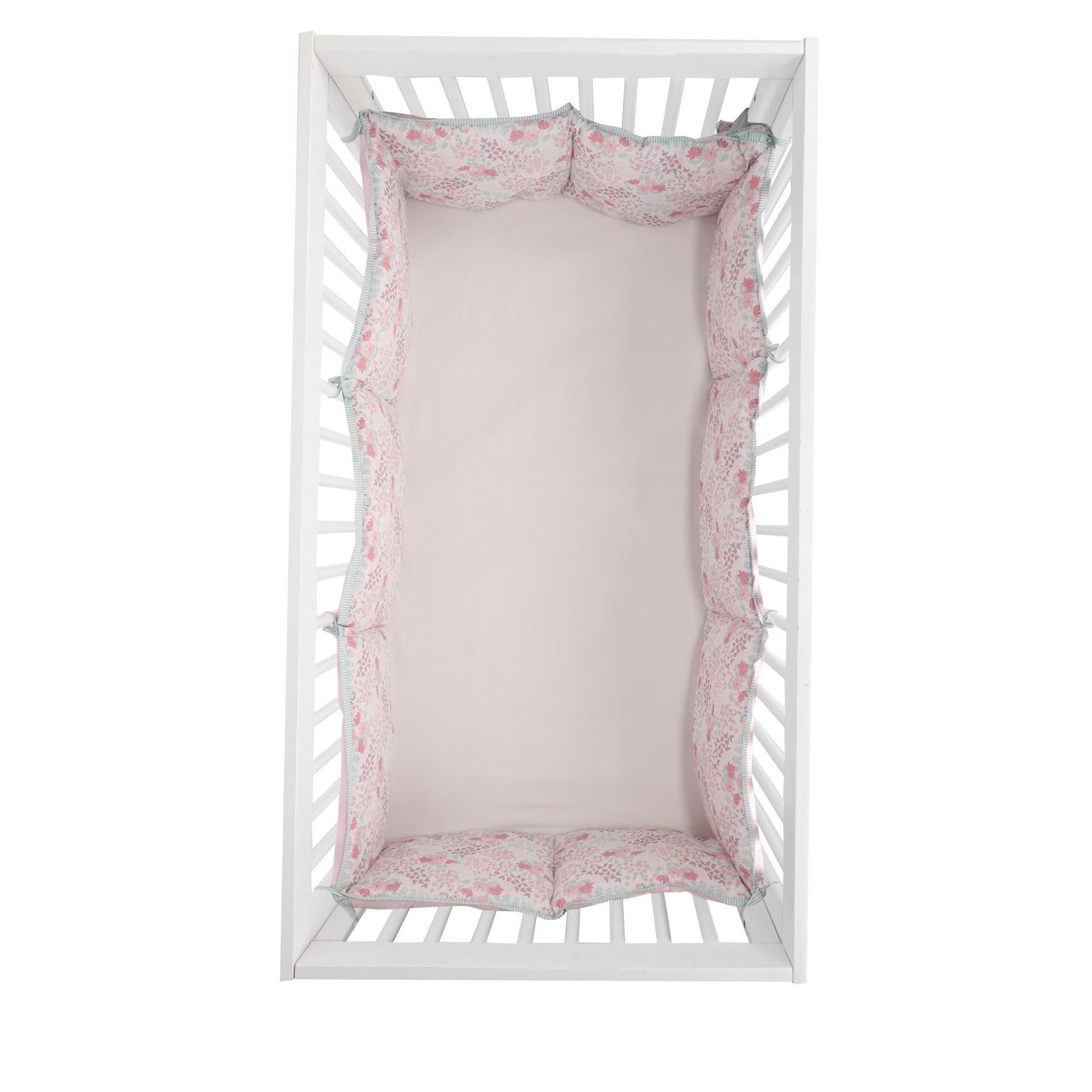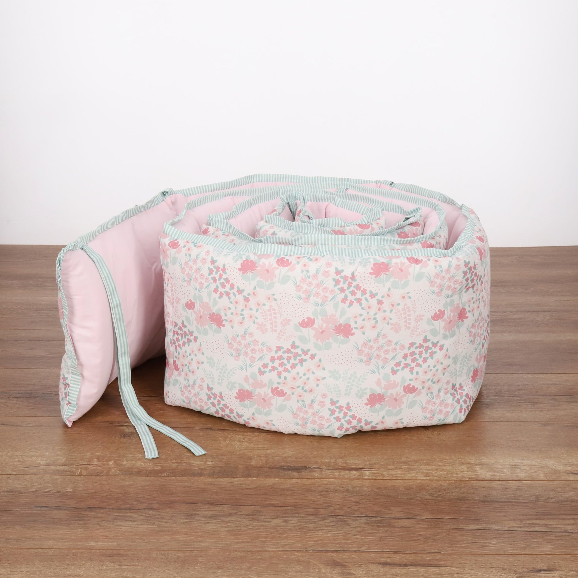 Tu bebé siempre se va a mantener seguro y cómodo durmiendo en su cuna protegido por nuestro protector (bumper) para cuna de 4 lados. Fabricado con tela estampada con diseños únicos de campos de flores en varios tonos de rosa y mamey con toques de verde seco. Es 60% algodón y no flamables. Cumple con todos los lineamientos de puericultura y seguridad para tu bebé. Ideal para que tu bebé no se golpeé con los barrotes de su cuna, ni se le atoren sus piernitas y bracitos entre los barrotes del barandal.Disponible para medida de cuna (1.30 x .70 mt) y cama cuna (1.40 x .95)