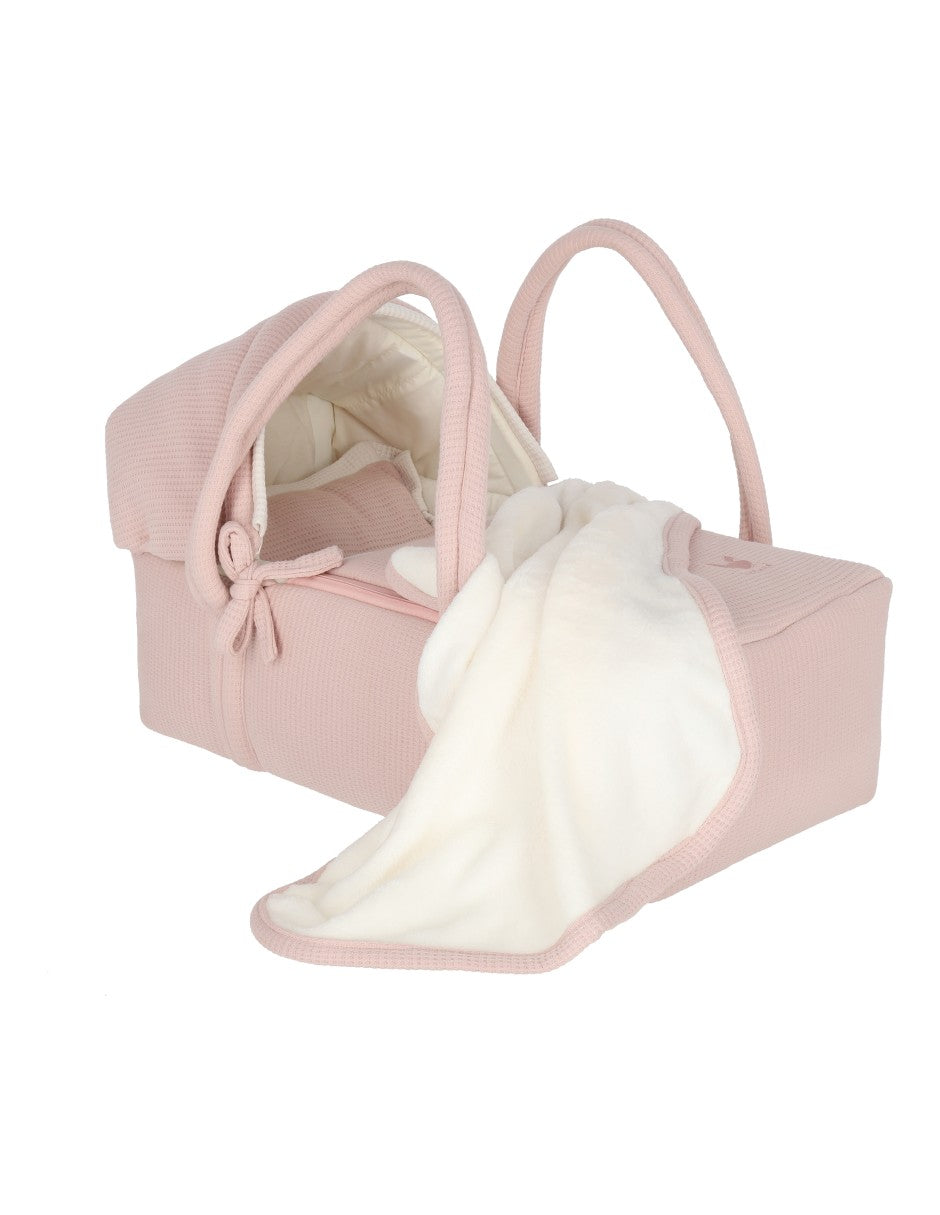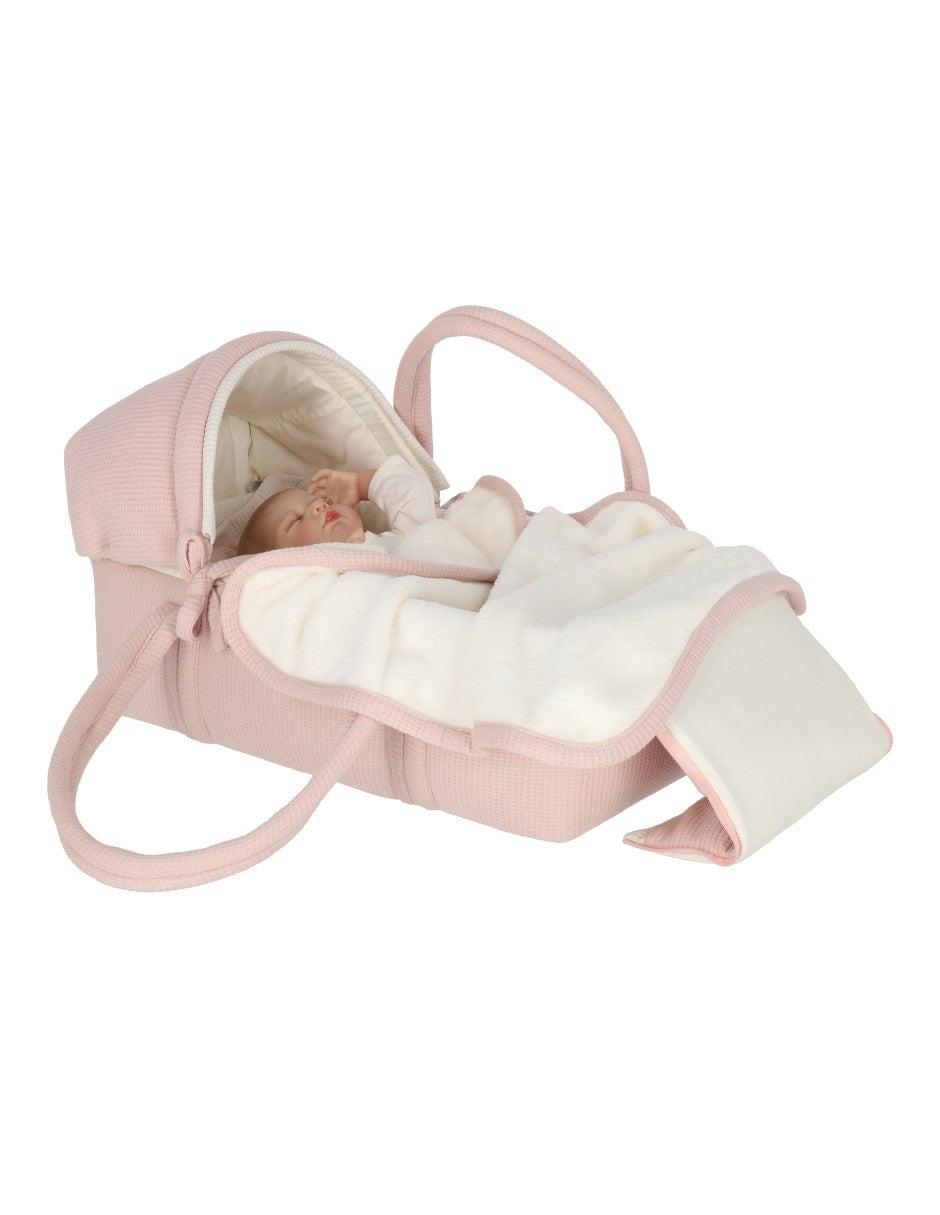 Set de Bambineto para muñeca cuadritos rosa con cobija de peluche beige. El bambineto tiene la base y la tapa de fina tela rosa palo con textura de cuadritos y detalles en color beige. Tiene una tapa de la misma tela con 2 cierres de la misma tela para cubrir a la muñeca Ideal para que las niñas juegues con sus muñecas, acuesten a sus bebés, los pongan al lado de su cama como cunas y las lleven a cualquier lado. Las asas de tela están súper reforzadas para cargar a la muñeca a cualquier lugar. el armazón es de fierro soldado super resistente e incluye colchón con sábana de cajón blanca. La tapa tiene dos cierres que se abren hasta abajo para recostar a la muñeca fácilmente. Se puede quitar la funda del bambineto, el armazón y el soporte de madera para lavar en casa.