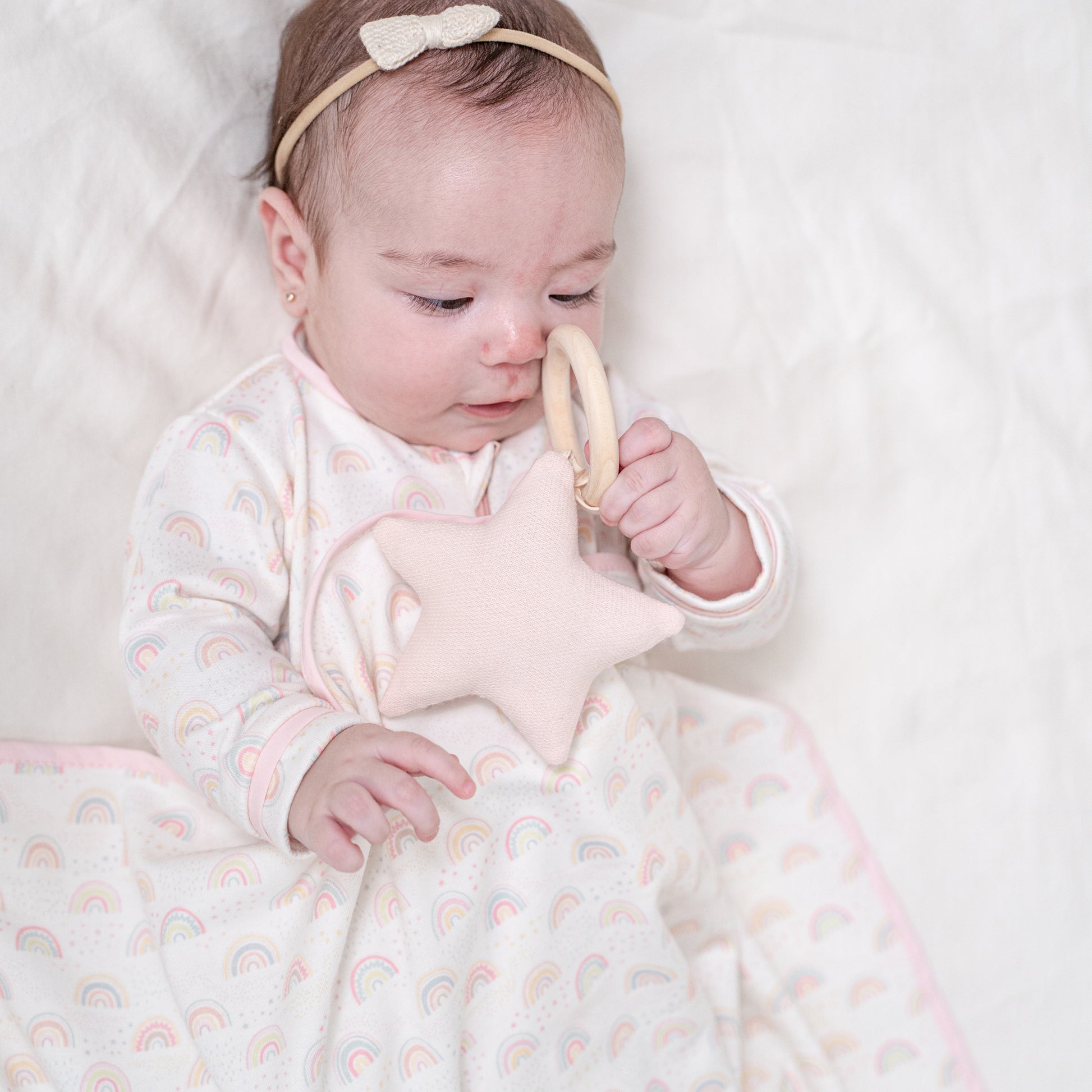 Set de frazada impresa con con estrellas y nubes en tonos de gris en tejido de punto con sonaja de estrella de peluche rosa con aro de madera.