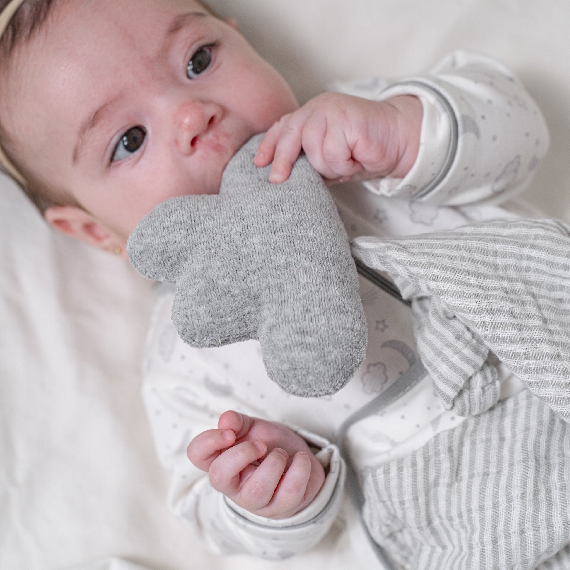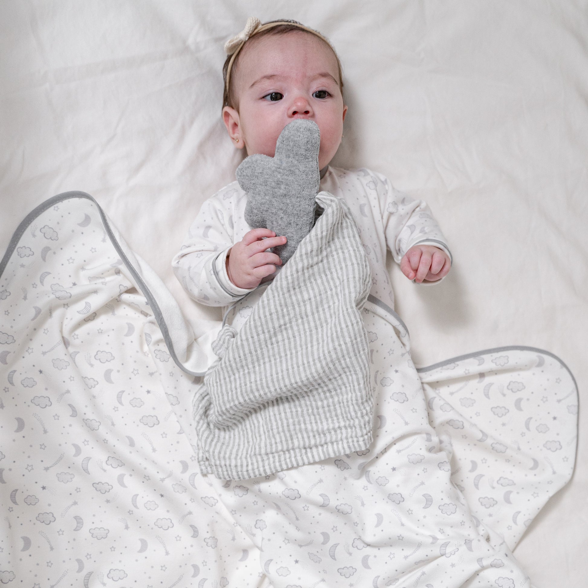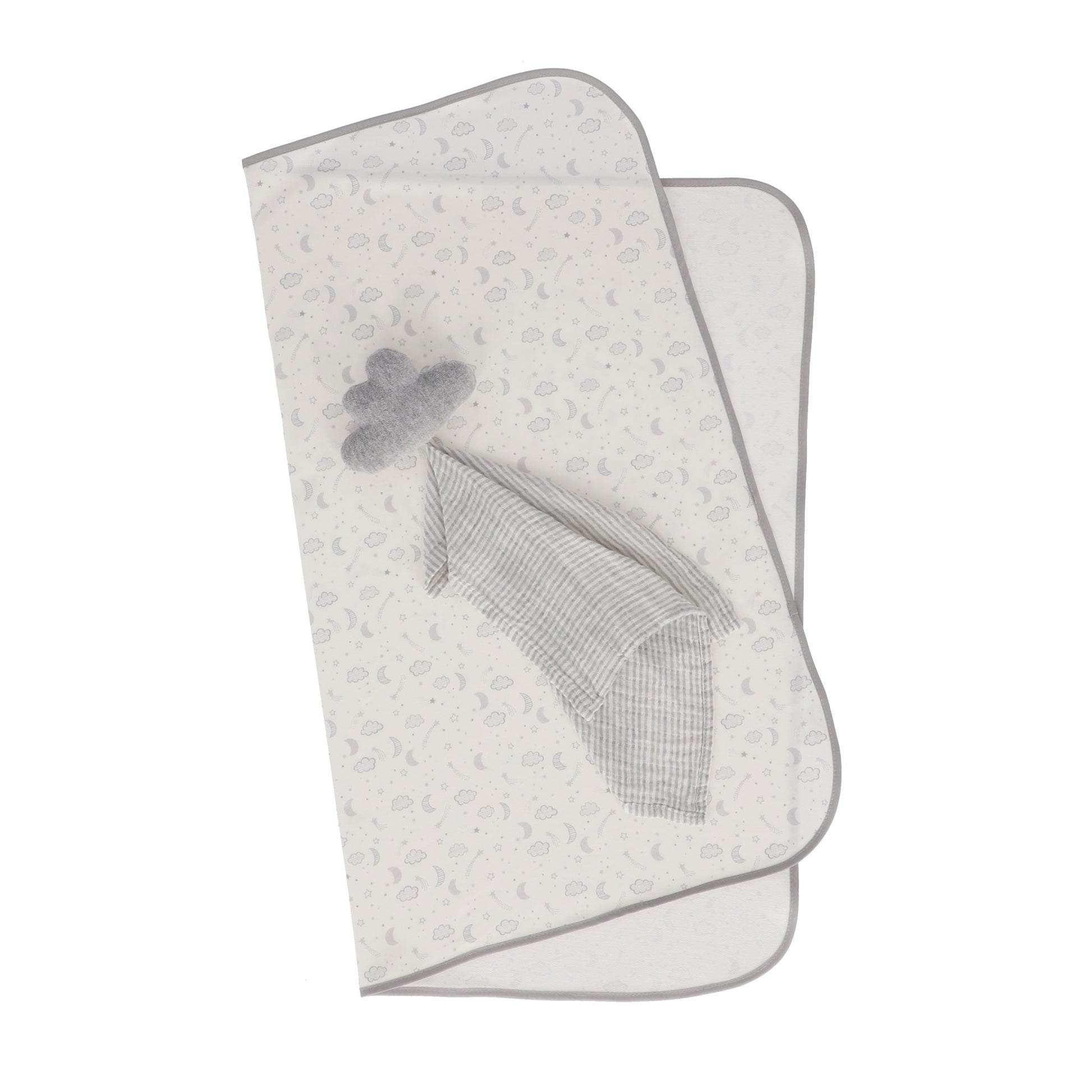 Set de frazada impresa con con estrellas y nubes en tonos de gris en tejido de punto con trapo de apego de nube de peluche con cuadro de tela de muselina super suave 100% algodón de rayitas gris con blanco.