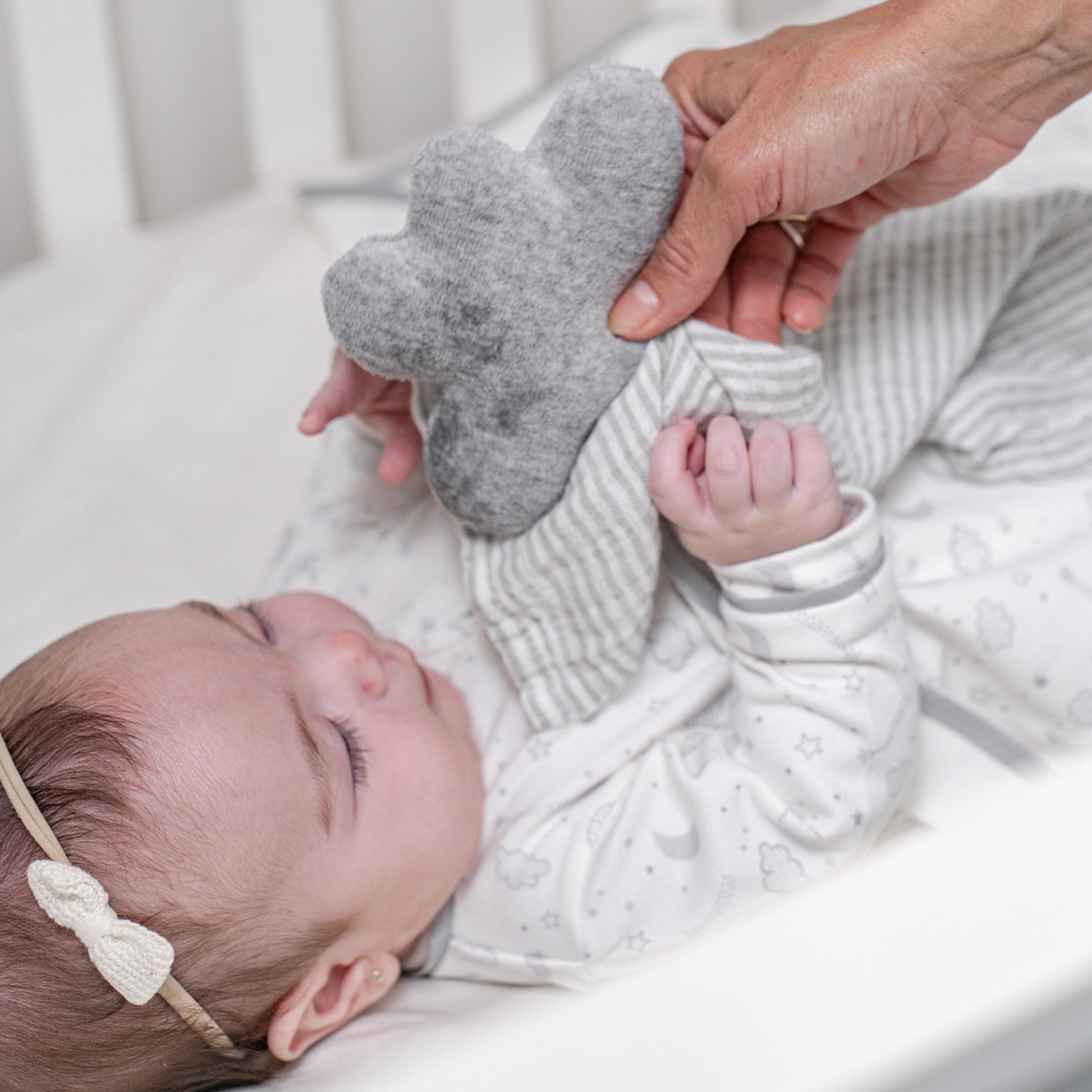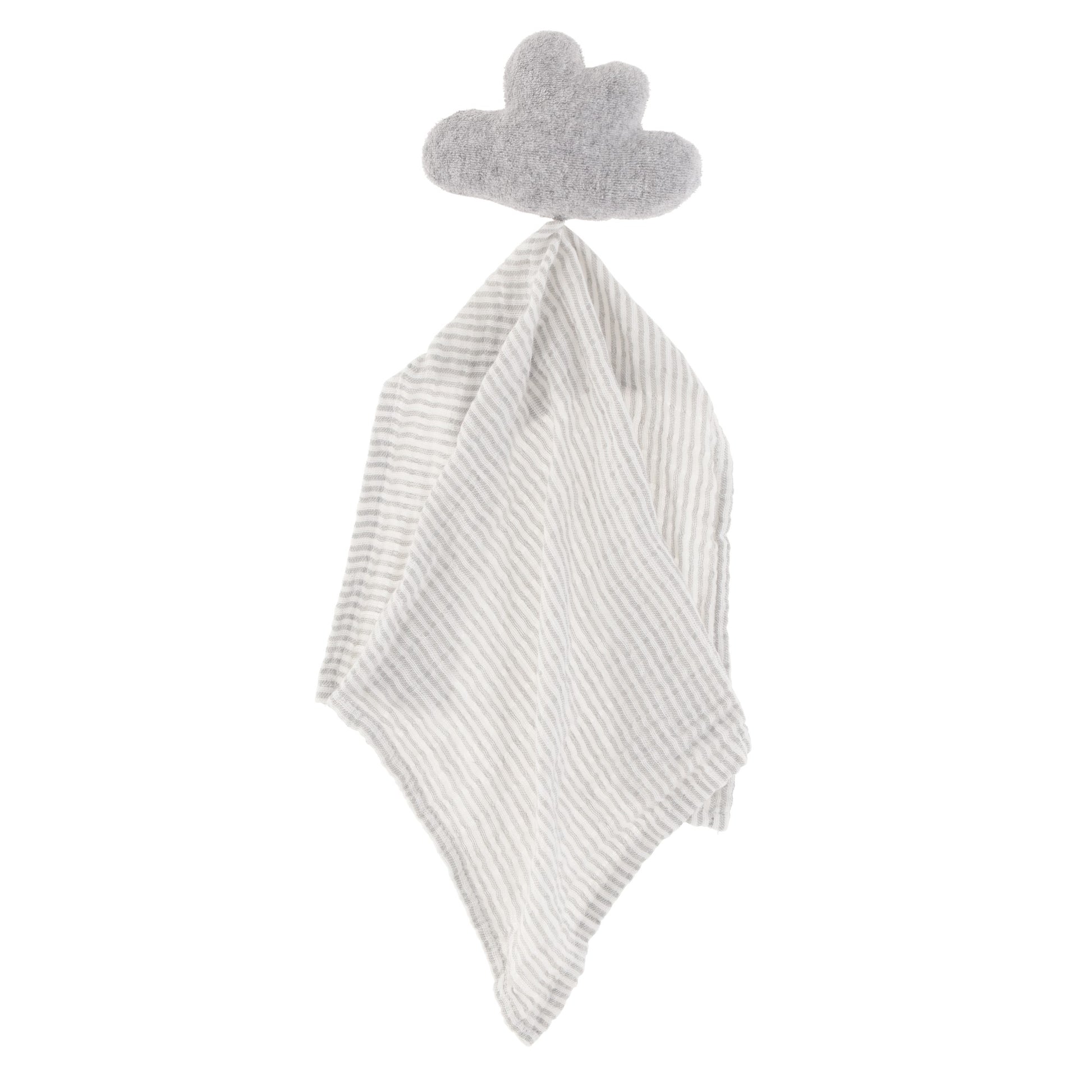 2. Trapo de apego de nube de peluche con cuadro de tela de muselina super suave 100% algodón de rayitas gris con blanco. Es un tierno y útil regalo para cualquier bebé, ta que ofrece seguridad cuando la mamá no está. Estimula el reflejo palamar que ayuda al bebé a relajarse cuando el bebé está en contacto con la tela suave de la muselina.