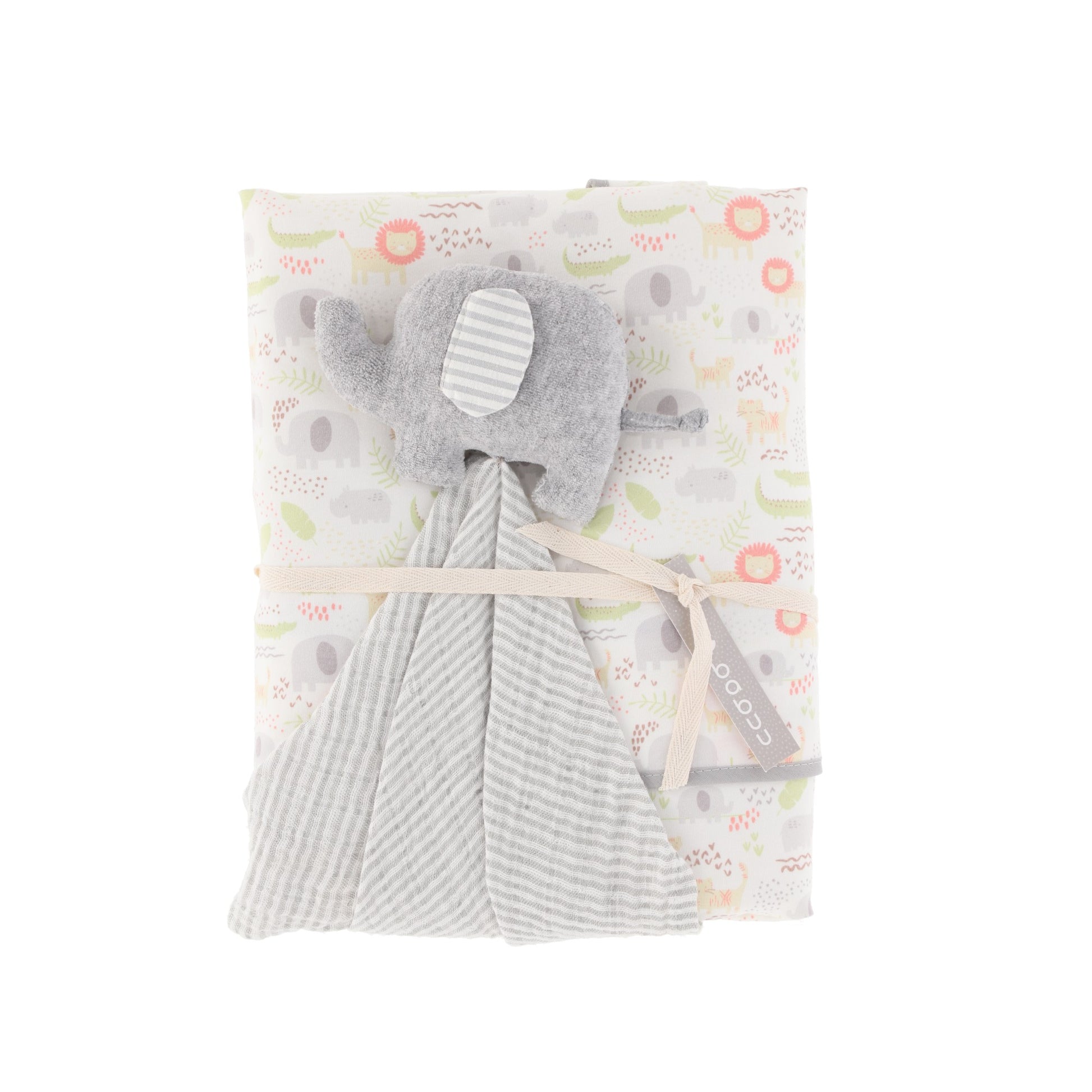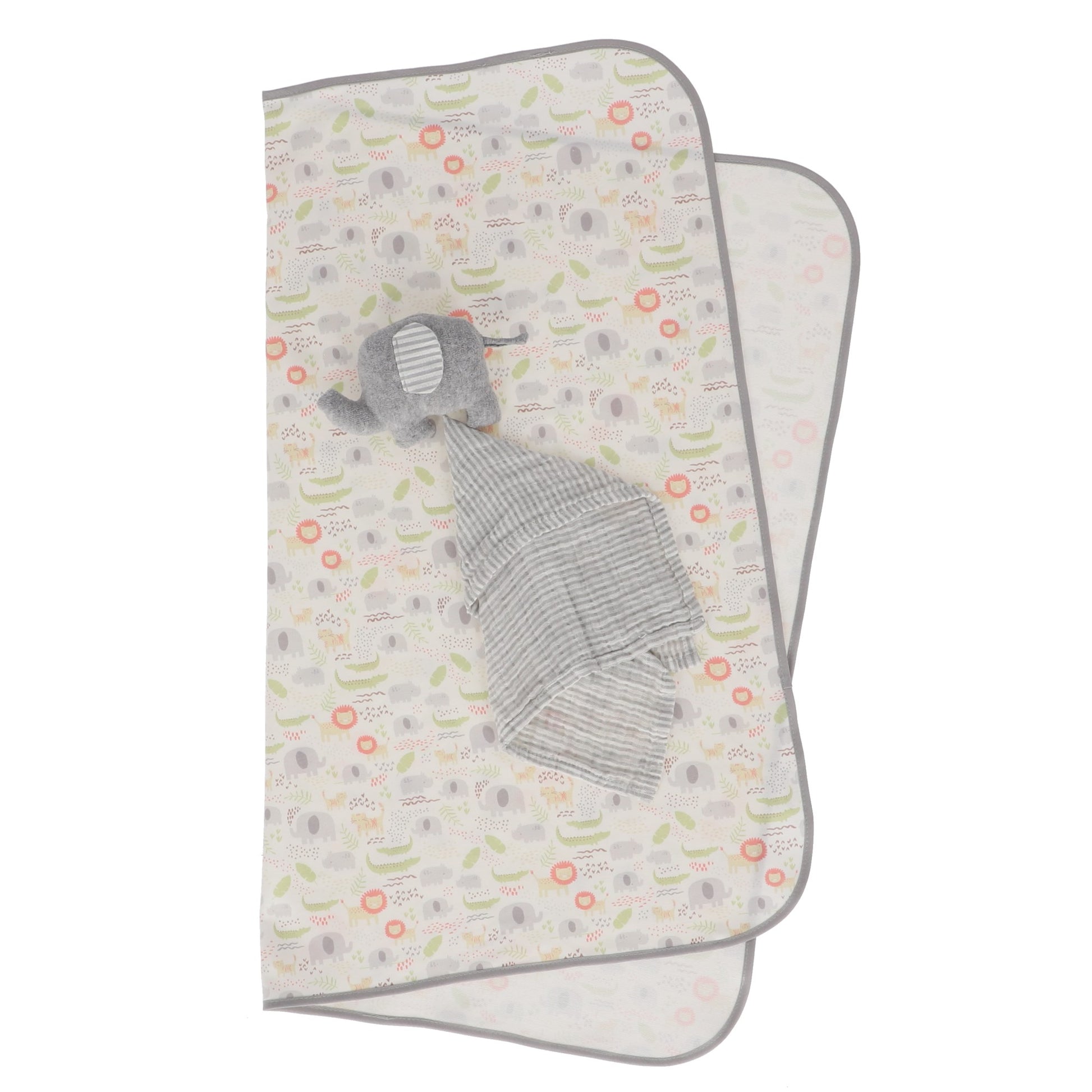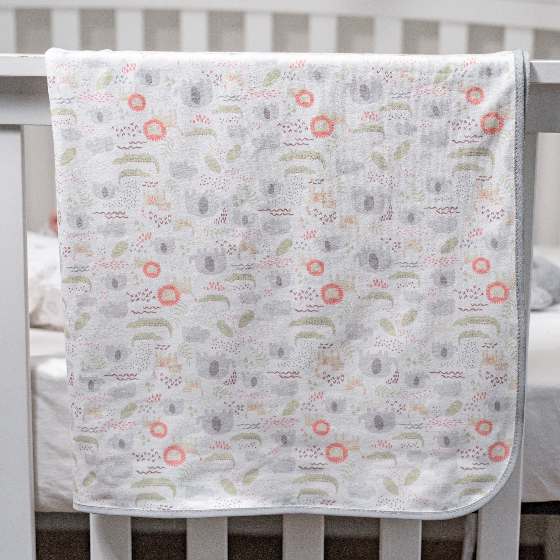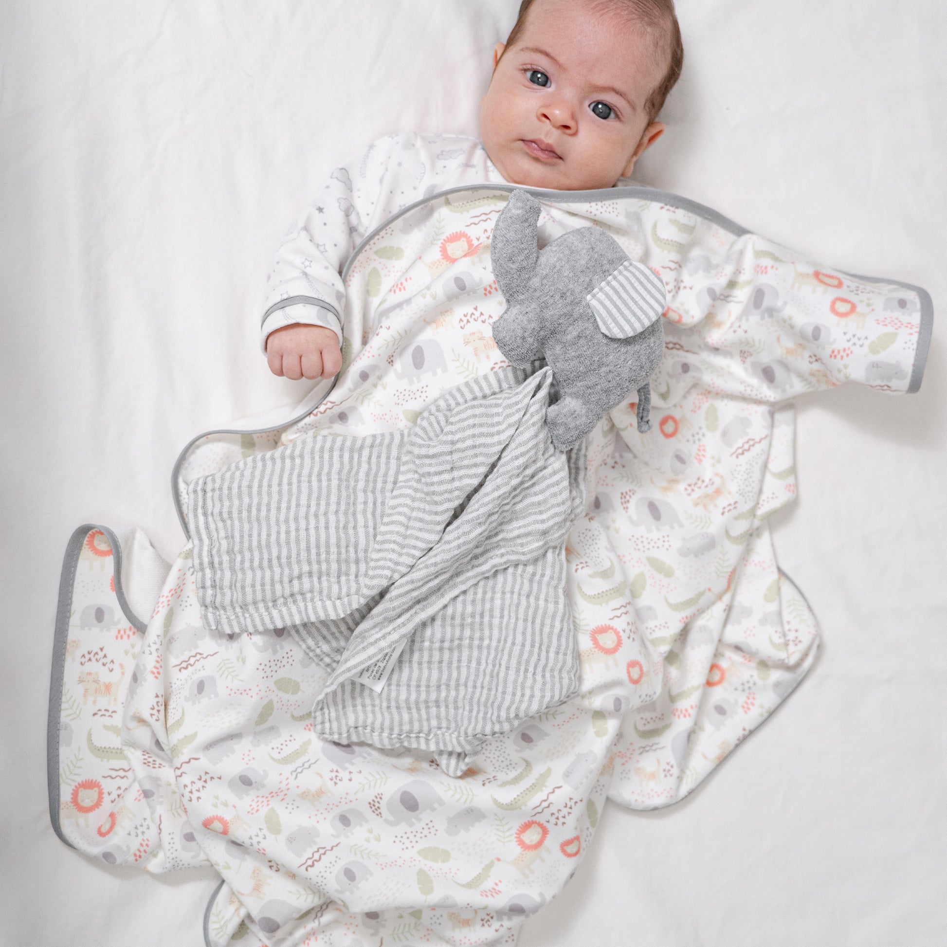 Set de frazada impresa con leones, elefantes, cocodrilos y tigres en tonos de gris, verde seco, naranja y amarillo claro, en tejido de punto con trapo de apego de elefante gris de peluche con cuadro de tela de muselina super suave 100% algodón de rayitas gris con blanco.